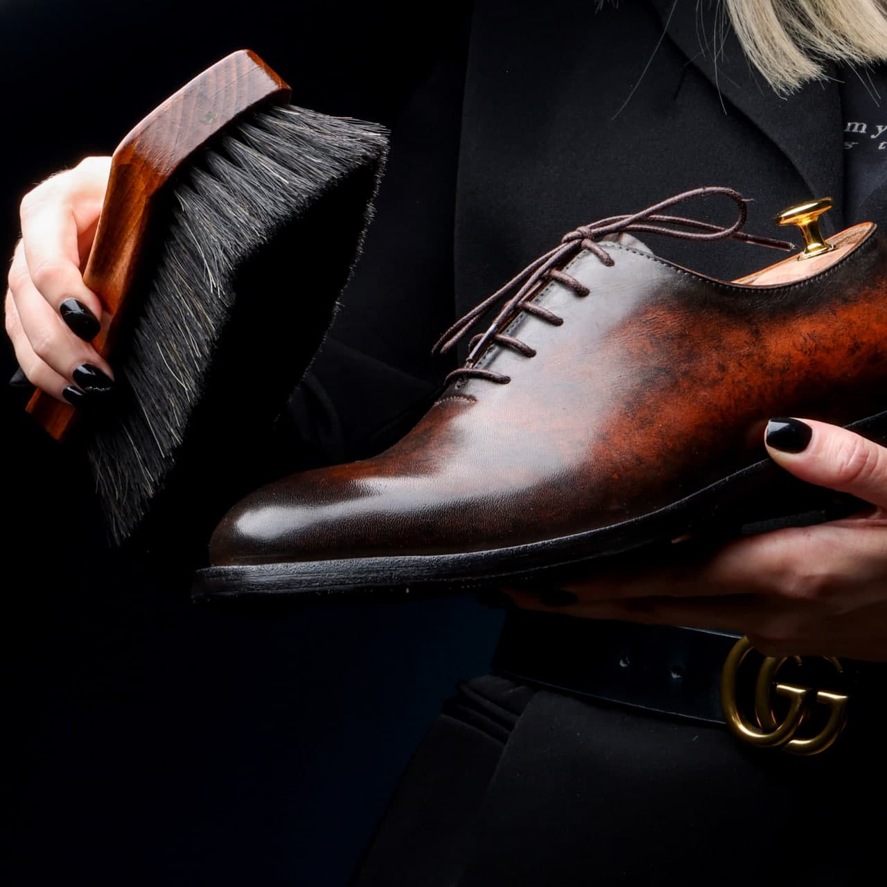 Тонирование цвета. После удаления загрязнений частично удаляется пигмент. Чтобы восстановить цвет, мастер тонирует обувь